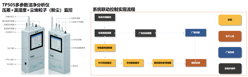 拓普瑞TP505潔凈度分析儀是業(yè)內(nèi)首款在線式集塵埃粒子、溫濕度、壓差、露點溫度、風(fēng)速等6種可測參數(shù)、11個數(shù)值顯示為一體 滿足了鋰電池生產(chǎn)過程中的各種環(huán)境測試,并具備了與廠房控制系統(tǒng)對接,MES制造執(zhí)行系統(tǒng)對接,具有開放式的對接協(xié)議,不需要再配其它儀表以及二次開發(fā)。