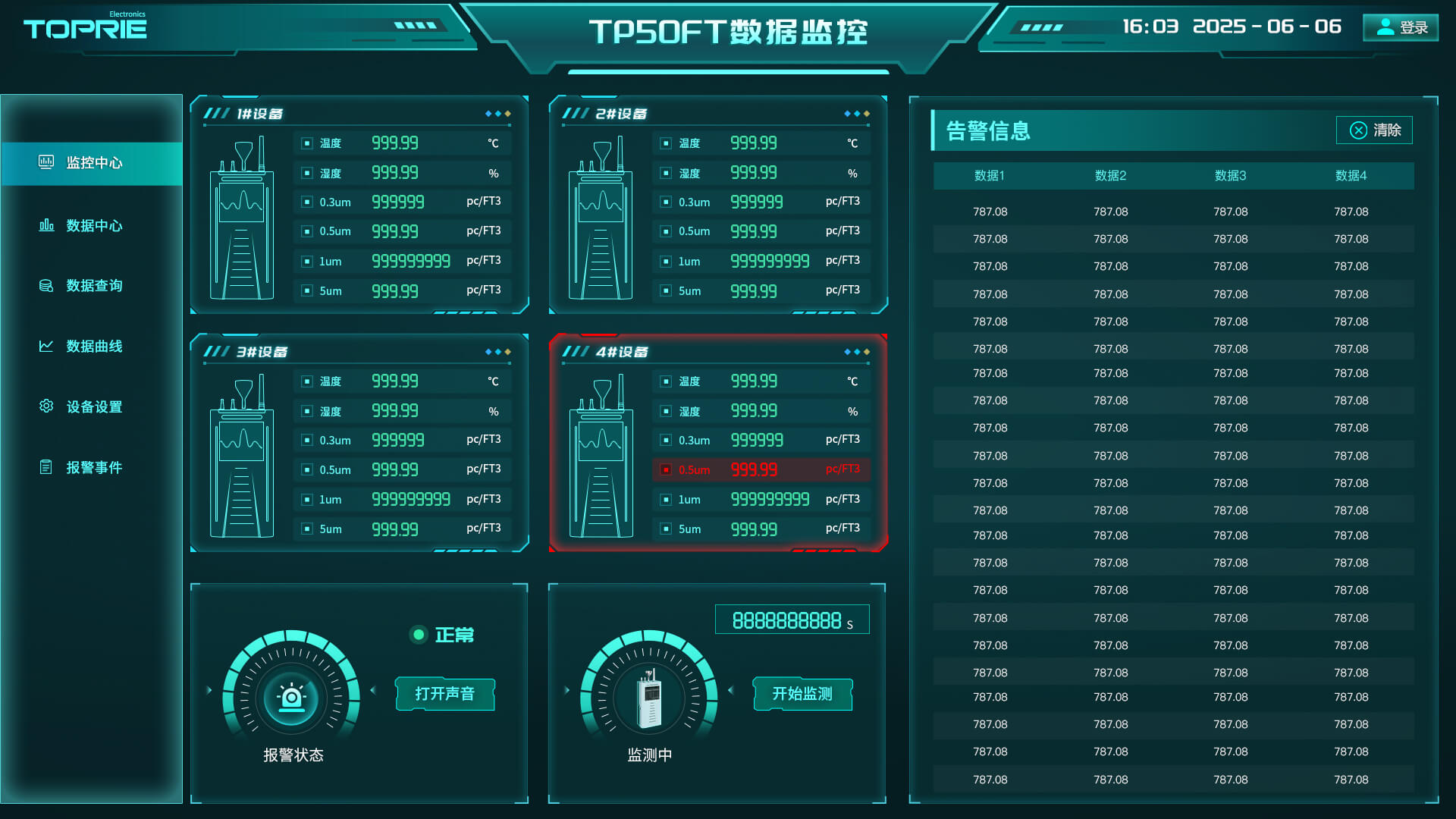 TP505支持上下限報(bào)警功能,用戶可參考ISO標(biāo)準(zhǔn)中潔凈室等級(jí)劃分的粒子濃度限值,如ISO 5級(jí)潔凈室對≥0.5μm粒子的濃度限值為3520個(gè)/m3,設(shè)置合理的報(bào)警閾值。例如,對于ISO 5級(jí)潔凈室,可設(shè)置0.5μm粒子濃度的報(bào)警上限;對于不同潔凈區(qū)之間的壓差,可設(shè)置最小壓差報(bào)警值,確保壓差梯度始終符合規(guī)范要求。