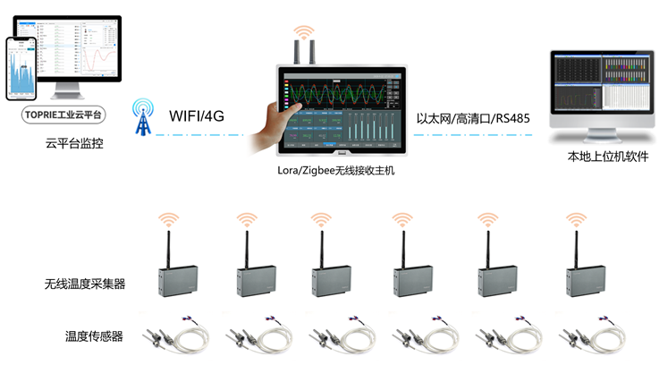 為了能檢測涂布中各個(gè)的點(diǎn)溫度變化,并存保存溫度數(shù)據(jù),現(xiàn)場采集溫度點(diǎn)不方便布線,要求采用無線數(shù)據(jù)傳輸監(jiān)控管理報(bào)警。拓普瑞采用Lora或Zigbee無線組網(wǎng)支持同時(shí)測試200通道方案,系統(tǒng)由TT-K-30溫度熱電偶線、無線溫度采集器TP1608、無線接收主機(jī)TP1100、客戶端軟件組成。技術(shù)成熟,可靠性高,經(jīng)濟(jì)可行。組網(wǎng)模式采用Client/Server架構(gòu),采用分布式星型布點(diǎn),集中監(jiān)控的原則,使單點(diǎn)故障互不影響,測試數(shù)據(jù)能真實(shí)反映現(xiàn)場溫度情況,統(tǒng)一監(jiān)控和獨(dú)立測控相結(jié)合,這樣大大提高了系統(tǒng)的可靠性。