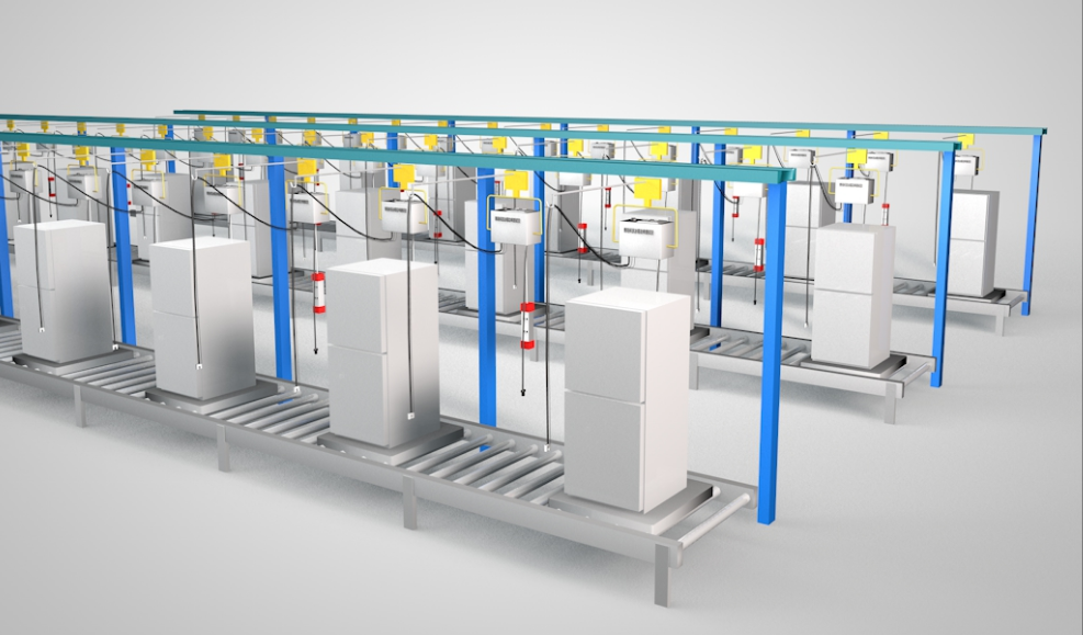 對冷干機生產(chǎn)測試建一套環(huán)形動態(tài)檢測系統(tǒng)。采用拓普瑞TP650電參數(shù)溫度采集器測試其工作狀態(tài)時的電壓,電流,功率,溫度等參數(shù)。每條產(chǎn)線由 40個工位組成動態(tài)環(huán)形檢測系統(tǒng),每個工位安裝一臺TP650電參數(shù)溫度采集器,在產(chǎn)品檢測前端安裝條碼掃描裝置,系統(tǒng)對各個冷干機產(chǎn)品的條碼和測試工作臺的條碼分別進行掃描識別使被檢測冷干機與測試工作臺進行綁定,后期測試冷干機的數(shù)據(jù)依其身份條碼進行綁定。