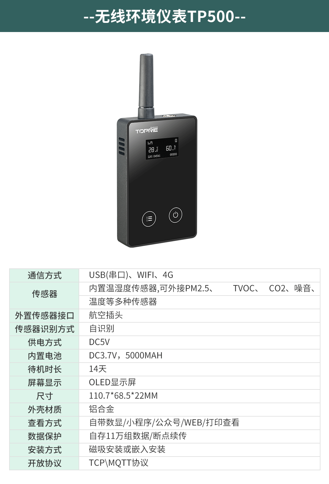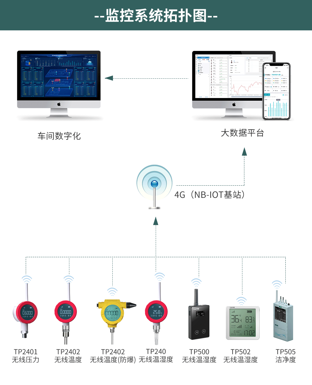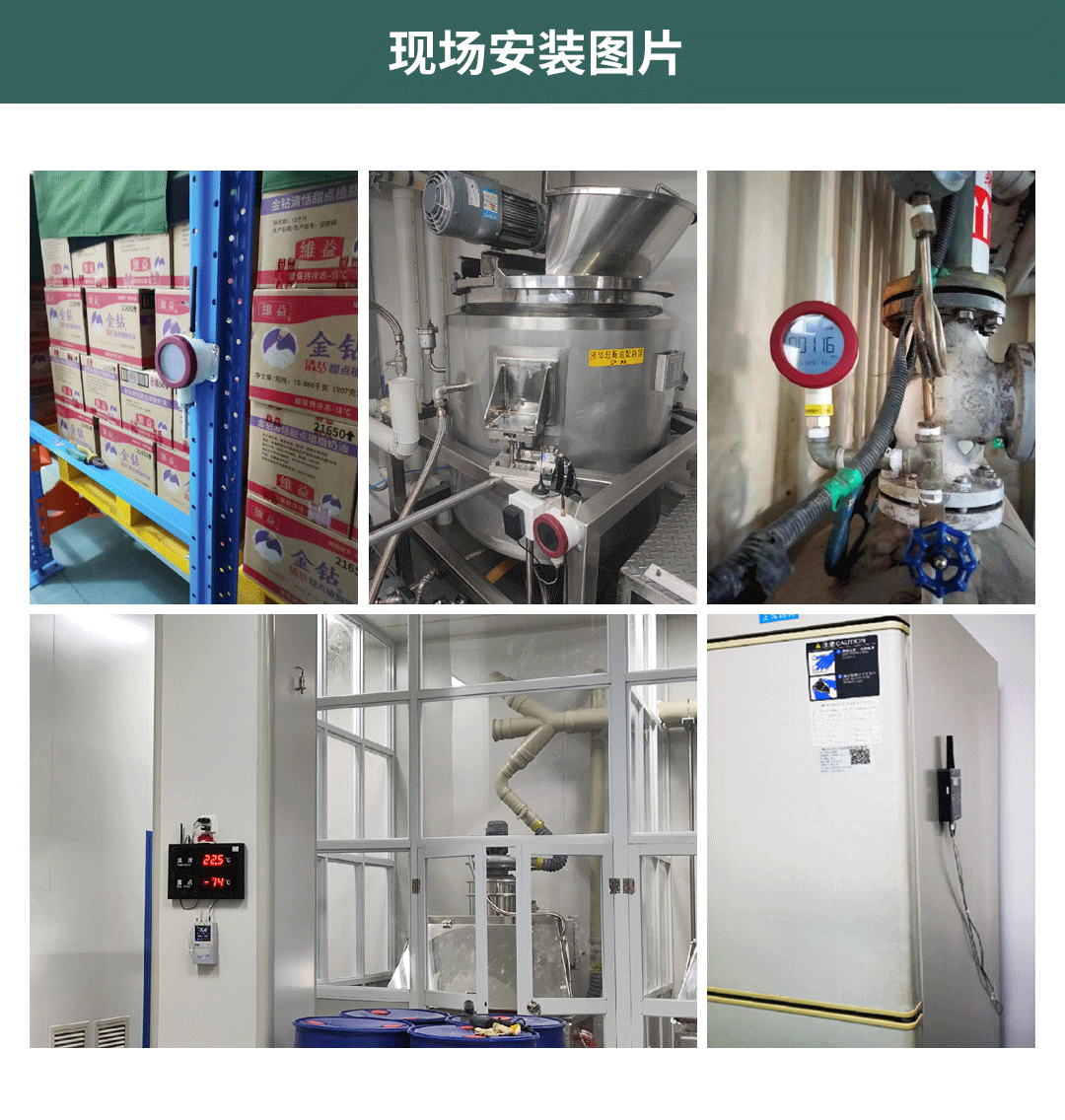 根據(jù)客戶不同的場(chǎng)景使用不同的傳感器進(jìn)行測(cè)量,比如冰箱或者冷庫(kù)的溫濕度采用TP500或者TP2406進(jìn)行測(cè)量,車間內(nèi)溫濕度可以采用TP500或者TP502進(jìn)行測(cè)量,管道蒸汽溫度或者管道油溫和水溫采用TP2402進(jìn)行測(cè)量,蒸汽壓力、油壓、水壓、氣壓等壓力采用TP2401進(jìn)行測(cè)量,生產(chǎn)車間的潔凈度采用TP505進(jìn)行測(cè)量