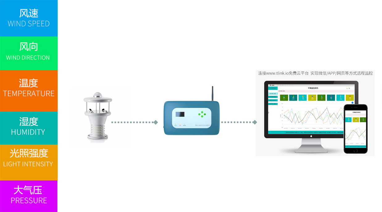 氣象傳感器通過TP310多功能RTU,以2G/3G/4G網(wǎng)絡或者以太網(wǎng)方式將各監(jiān)測點的數(shù)據(jù)上傳到監(jiān)控系統(tǒng),通過移動端或者PC端訪問云平臺查看實時上傳的數(shù)據(jù)。同時通過監(jiān)控系統(tǒng)設置報警,微信,短信,語音推送。