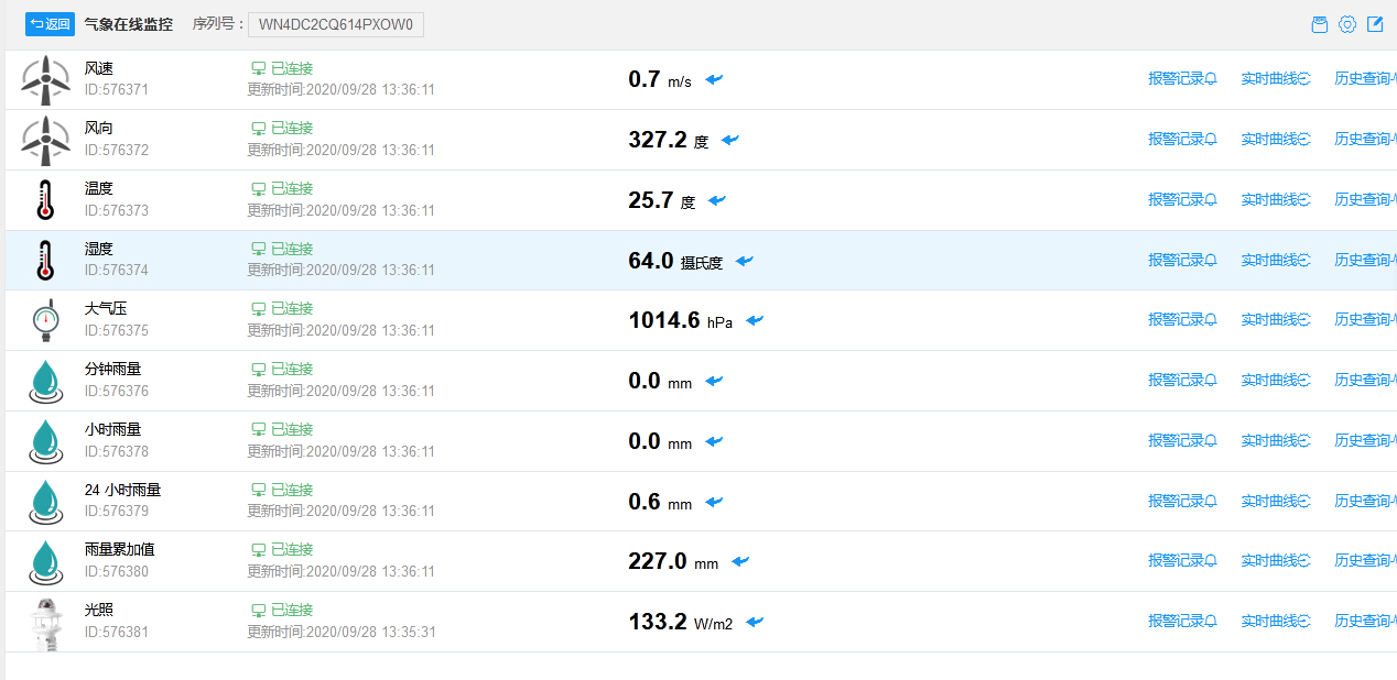 (1)24小時不間斷記錄功能:可在線實時24小時連續(xù)的采集和記錄監(jiān)測點位的濕度、風向、風速、雨量、氣壓、太陽輻射、土壤溫濕度等各項參數(shù)情況。
