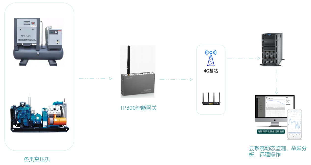 現(xiàn)代工業(yè)中壓縮空氣作為工廠(chǎng)中常用的三大動(dòng)力源之一,具有來(lái)源廣泛,壓縮比高,輸送方便等特點(diǎn)因而壓縮空氣在工業(yè)制造領(lǐng)域得到了廣泛的應(yīng)用??諌簷C(jī)節(jié)能監(jiān)控系統(tǒng)主要通過(guò)自動(dòng)控制空壓機(jī)匹配用氣端負(fù)載,減少不必要的供氣壓力虛高,同時(shí)穩(wěn)定管網(wǎng)壓力,減少壓力波動(dòng)對(duì)生產(chǎn)及主機(jī)的沖擊。從主機(jī)、輔機(jī)、管網(wǎng)、末端四方面進(jìn)行全方位的節(jié)能。隨著計(jì)算機(jī)技術(shù)、通信技術(shù)、控制技術(shù)的發(fā)展,結(jié)合互聯(lián)網(wǎng)實(shí)現(xiàn)對(duì)設(shè)備運(yùn)行情況的集中管理和遠(yuǎn)程監(jiān)控變得日益重要。應(yīng)用拓普瑞4G無(wú)線(xiàn)智能網(wǎng)關(guān)可實(shí)現(xiàn)空氣壓縮機(jī)的遠(yuǎn)程監(jiān)控與故障診斷,為企業(yè)節(jié)省成本。