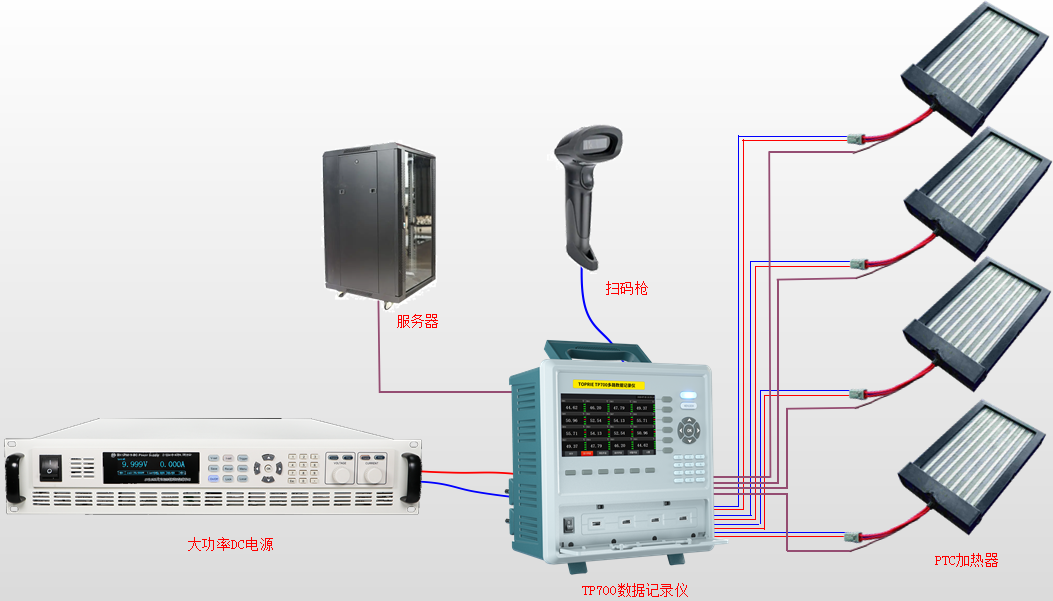 而我們TP700多路數(shù)據(jù)記錄儀具備測(cè)試多通道電流的功能,針對(duì)PTC加熱器,我們最需要關(guān)注的就是它上電后其工作的電流的穩(wěn)定性如何,它的溫度如何。拓普瑞TP700多通道數(shù)據(jù)記錄儀+多路電流采集模塊+溫度采集模塊可以同時(shí)測(cè)試多個(gè)PTC加熱器的工作電流和溫度。在生產(chǎn)PTC加熱器的測(cè)試過(guò)程中,我們通過(guò)檢測(cè)它工作的電流和溫度的數(shù)據(jù)是否在標(biāo)準(zhǔn)范圍內(nèi),記錄儀可以具有判斷這款PTC加熱器是否合格功能,同時(shí)TP700多路數(shù)據(jù)記錄儀可以接入掃碼槍?zhuān)瑢⒂涗浀拿恳粋€(gè)PTC加熱器的測(cè)試數(shù)據(jù)和PTC加熱器的編號(hào)捆綁在一起,并記錄到測(cè)試系統(tǒng)內(nèi)作永久保存。這樣就能夠?qū)⑺蠵TC加熱器產(chǎn)品的測(cè)試測(cè)量數(shù)據(jù)全部保存到廠家的管理系統(tǒng)內(nèi),做到每一個(gè)出廠的產(chǎn)品都是合格的并有據(jù)可查。