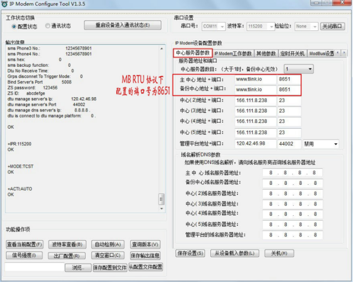 首先需要對拓普瑞GPRS DTU模塊進(jìn)行配置,采用modbus rtu協(xié)議,配置的端口號需要選擇8651,即采用平臺的MB RTU協(xié)議,TP4118的波特率為9600,配置DTU模塊的波特率就應(yīng)該為9600pbs,配置界面如下: