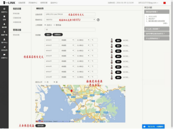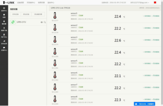 設(shè)置好相關(guān)的參數(shù),點(diǎn)擊保存設(shè)置以完成配置,點(diǎn)擊配置工具IP Modem Configure Tool右上角的關(guān)閉串口,DTU模塊將會進(jìn)入數(shù)據(jù)透傳工作狀態(tài),在TLINK平臺的監(jiān)控中心即可看到序列號對應(yīng)的設(shè)備顯示已連接,如下圖所示: