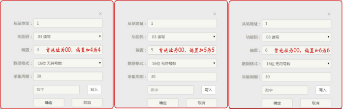 點(diǎn)擊讀寫指令,進(jìn)入?yún)f(xié)議配置界面,示例的TP4118設(shè)備地址為1,選擇03讀功能碼(平臺中的為讀寫,不影響使用),數(shù)據(jù)類型為16位無符號數(shù)據(jù),所以每個通道之間的偏置連續(xù)加1,詳情見TLINK物聯(lián)網(wǎng)云平臺開發(fā)者中心--Modbus文檔使用說明,配置如下圖“(示例只選擇了6個通道)所示: