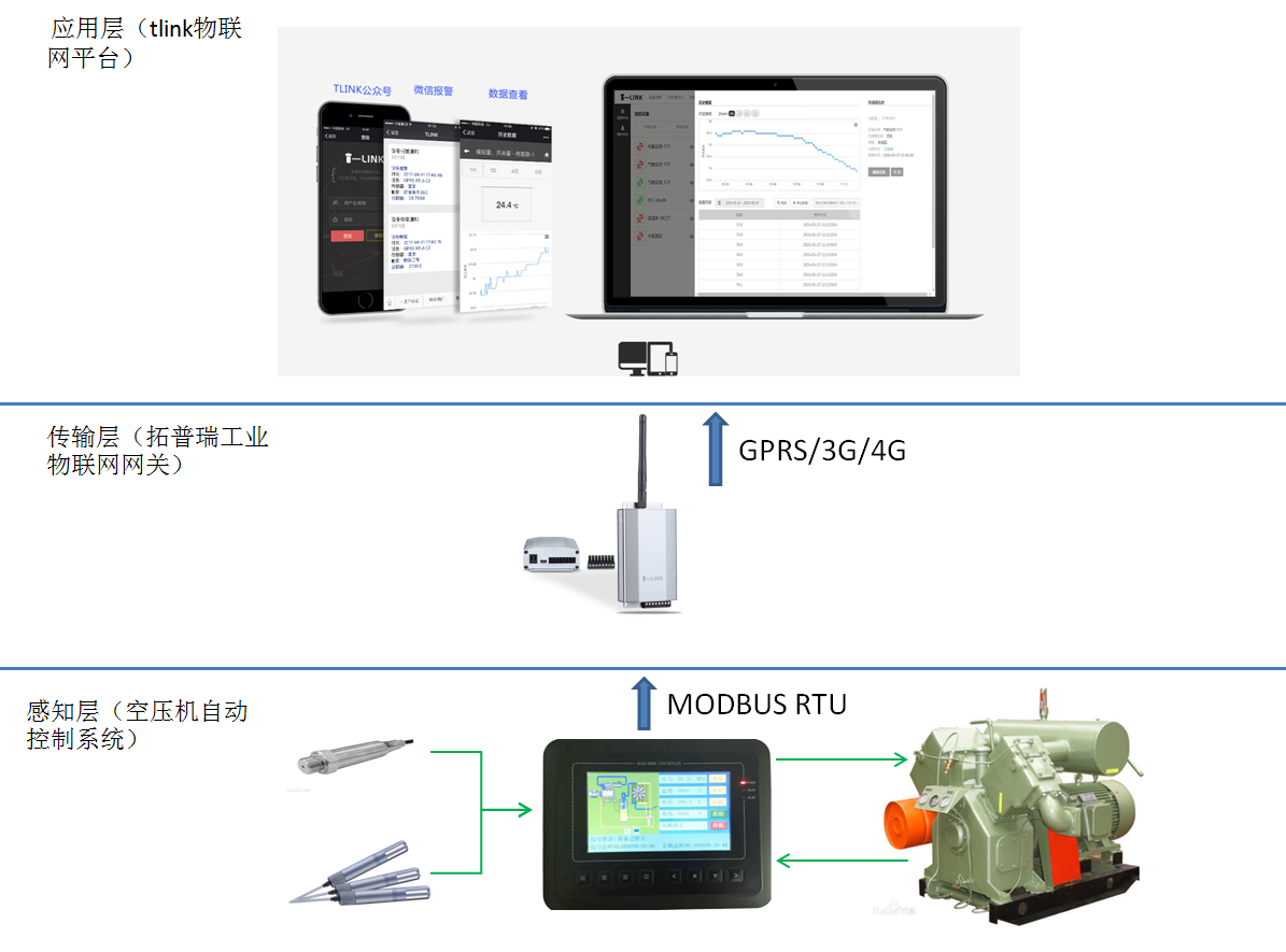 空壓機物聯(lián)網(wǎng)系統(tǒng)主要由感知層,傳輸層和應(yīng)用層這三個部分組成;