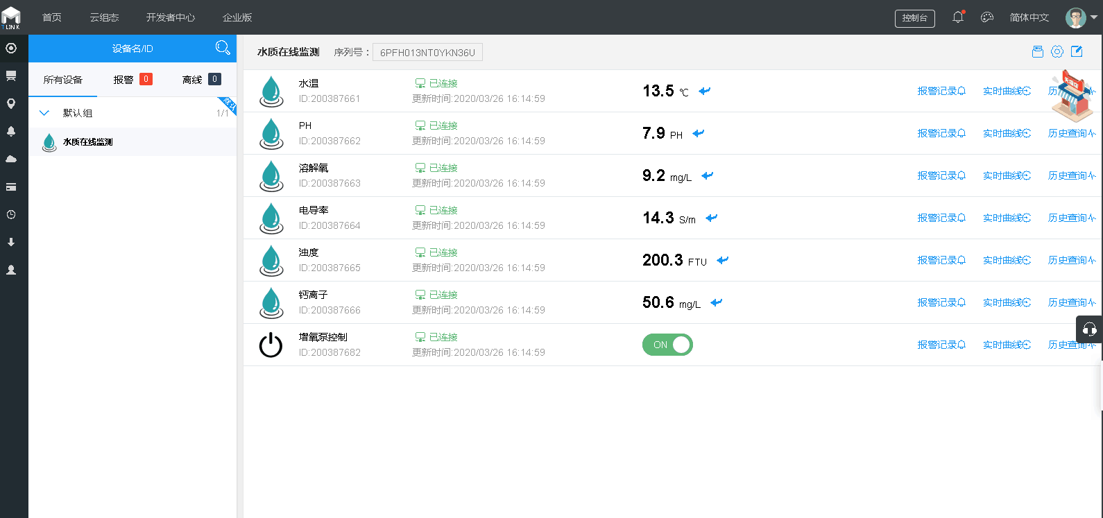(1)24小時(shí)不間斷監(jiān)測(cè)養(yǎng)殖環(huán)境水質(zhì)參數(shù),支持多種傳感器同時(shí)接入,包括溶氧傳感器、PH傳感器、溫度傳感器、電導(dǎo)率傳感器、ORP傳感器、濁度傳感器、等等;