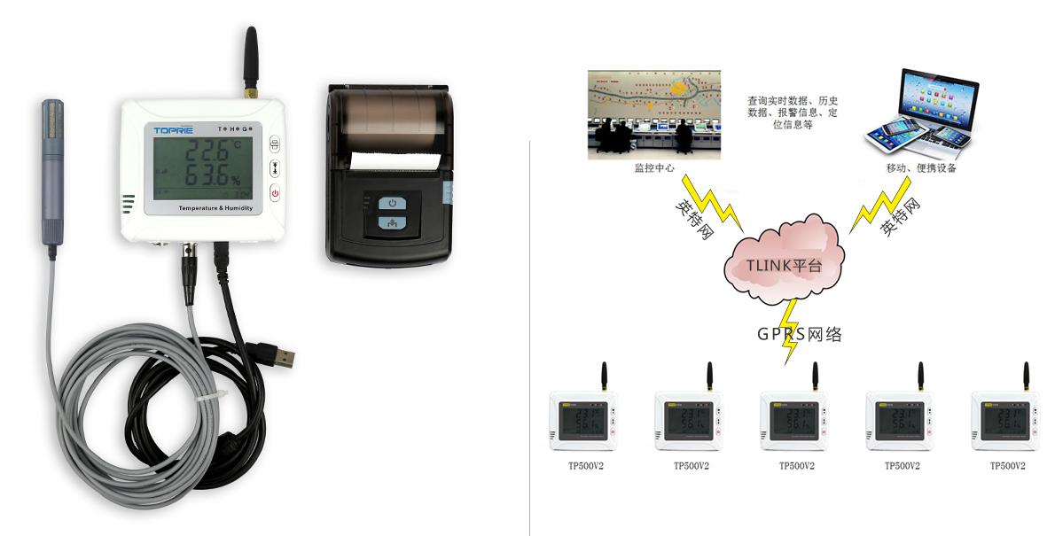 傳感器+TP500V2.0+打印機(jī)組成一套冷鏈監(jiān)控單元,。探頭可以是單通道溫濕度或雙通道溫度。支持云平臺(tái)連接,手機(jī)APP/微信/WEB遠(yuǎn)程數(shù)據(jù)監(jiān)控。