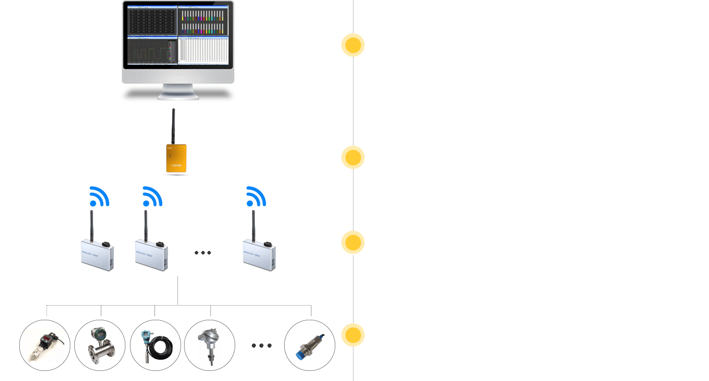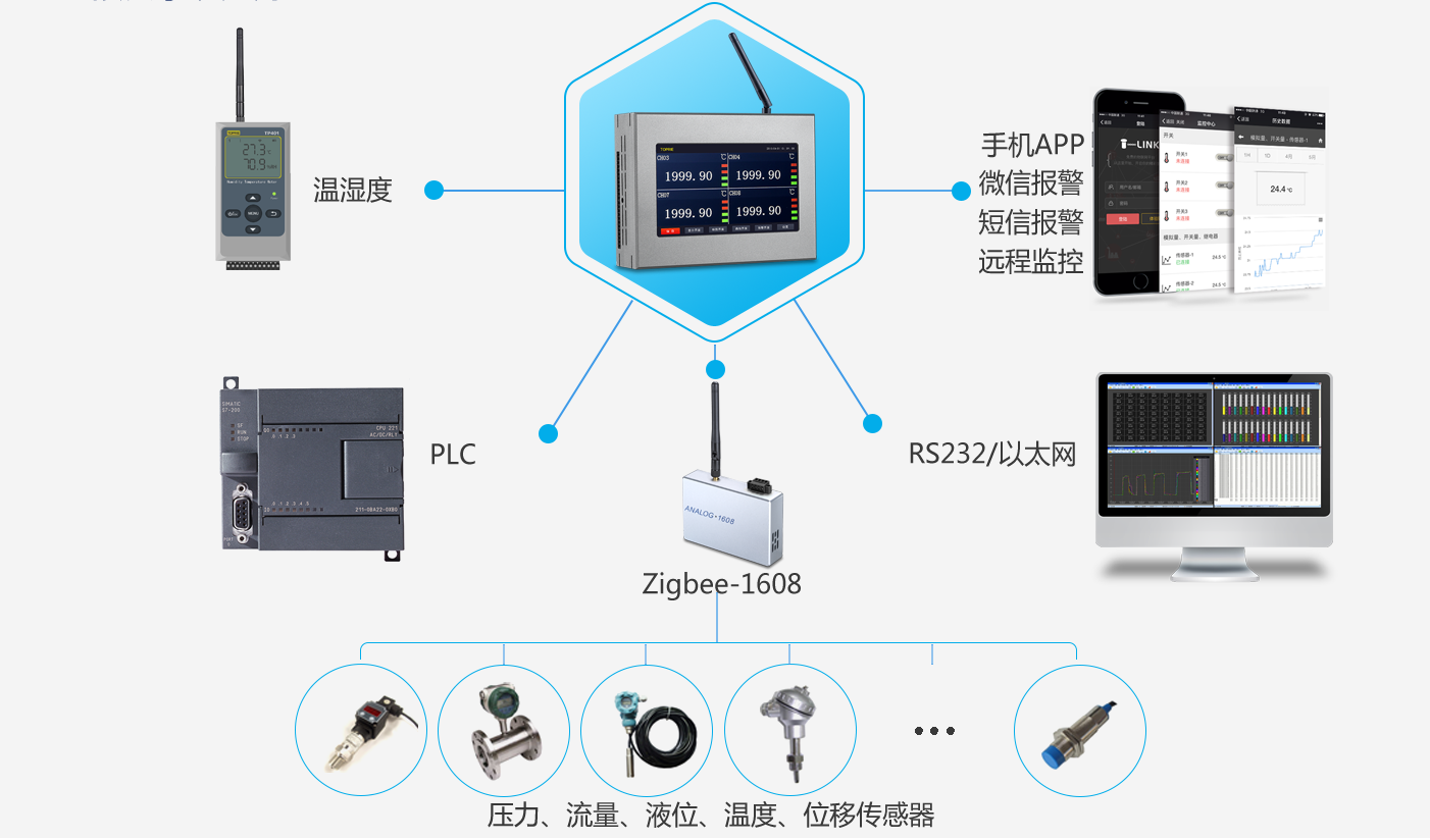 :采用ZIGBEE傳輸數(shù)據(jù)的數(shù)據(jù)采集卡模塊,無需布線,專業(yè)采集電壓、電流、溫度、濕度、壓力、振動(dòng)、頻率、流量、液位等信息。